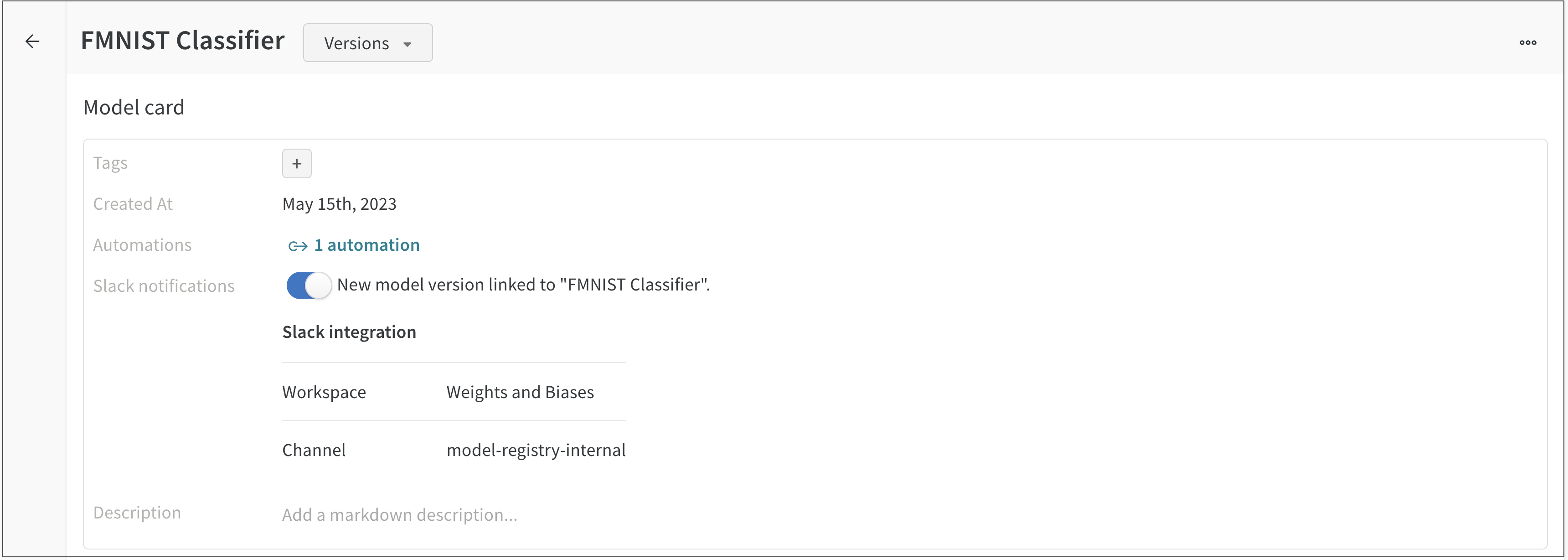 팀을 위한 Slack 알림이 구성되어 있으면, Connect Slack 버튼 대신 New model version linked to...라고 표시되는 토글이 나타납니다.